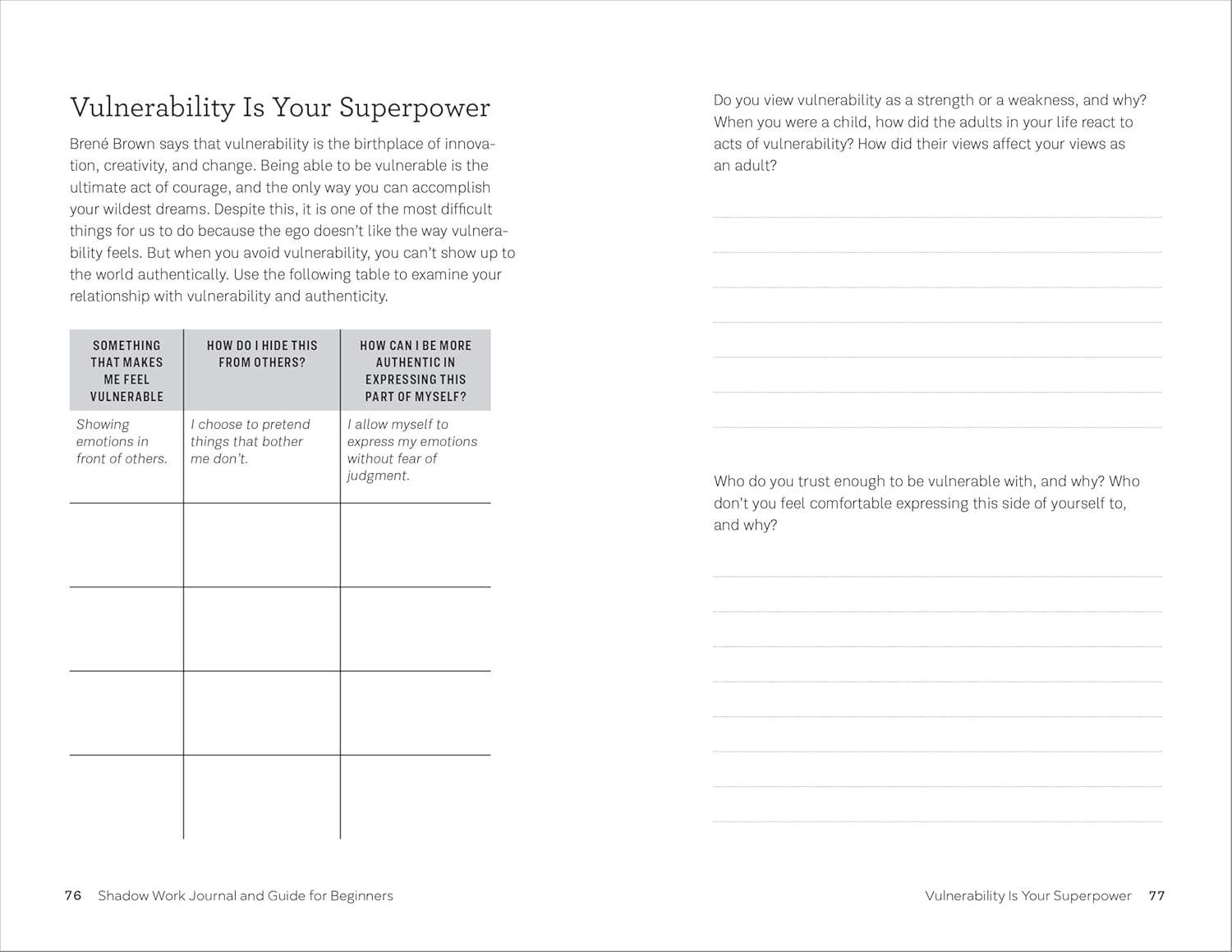 Filled with powerful writing prompts, meditations, and expert insights, this approachable journal helps new and experienced readers alike gently engage their shadow side. With Bramblett’s guidance as a trauma specialist and life coach, readers learn to map their emotional terrain, connect with their inner child, and move beyond guilt and shame towards clarity and peace. Start exploring the depths of your mind, overcome self-limiting beliefs, and discover greater fulfillment and confidence.