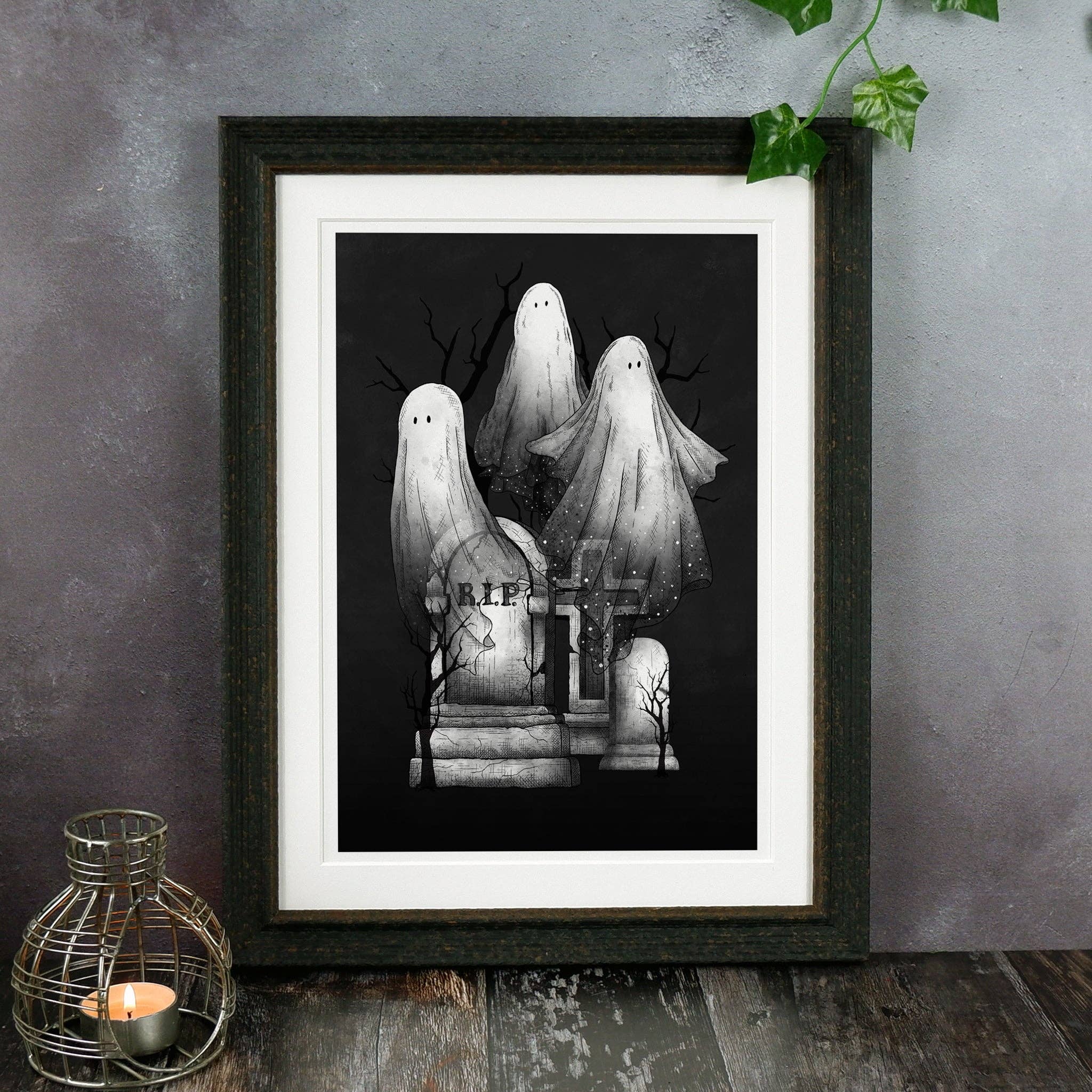 A cute giclée art print of a family of ghosts and graves. SIZE:  Available in 3 Sizes: A5 / 5.83 x 8.27 inch / 14.8 x 21 cm A4 / 8.27 × 11.69 inch / 21 x 29.7 cm A3 / 11.69 x 16.53 inch / 29.7 x 42 cm The size includes a small white border for easy framing. Unframed. MATERIALS: Printed on Fotospeed Smooth Pearl 290gsm - a beautiful paper with a semi-gloss finish that provides deep blacks and rich color tones. Packaged with board backer, Print is Dead branded backing paper and cellophane bag.