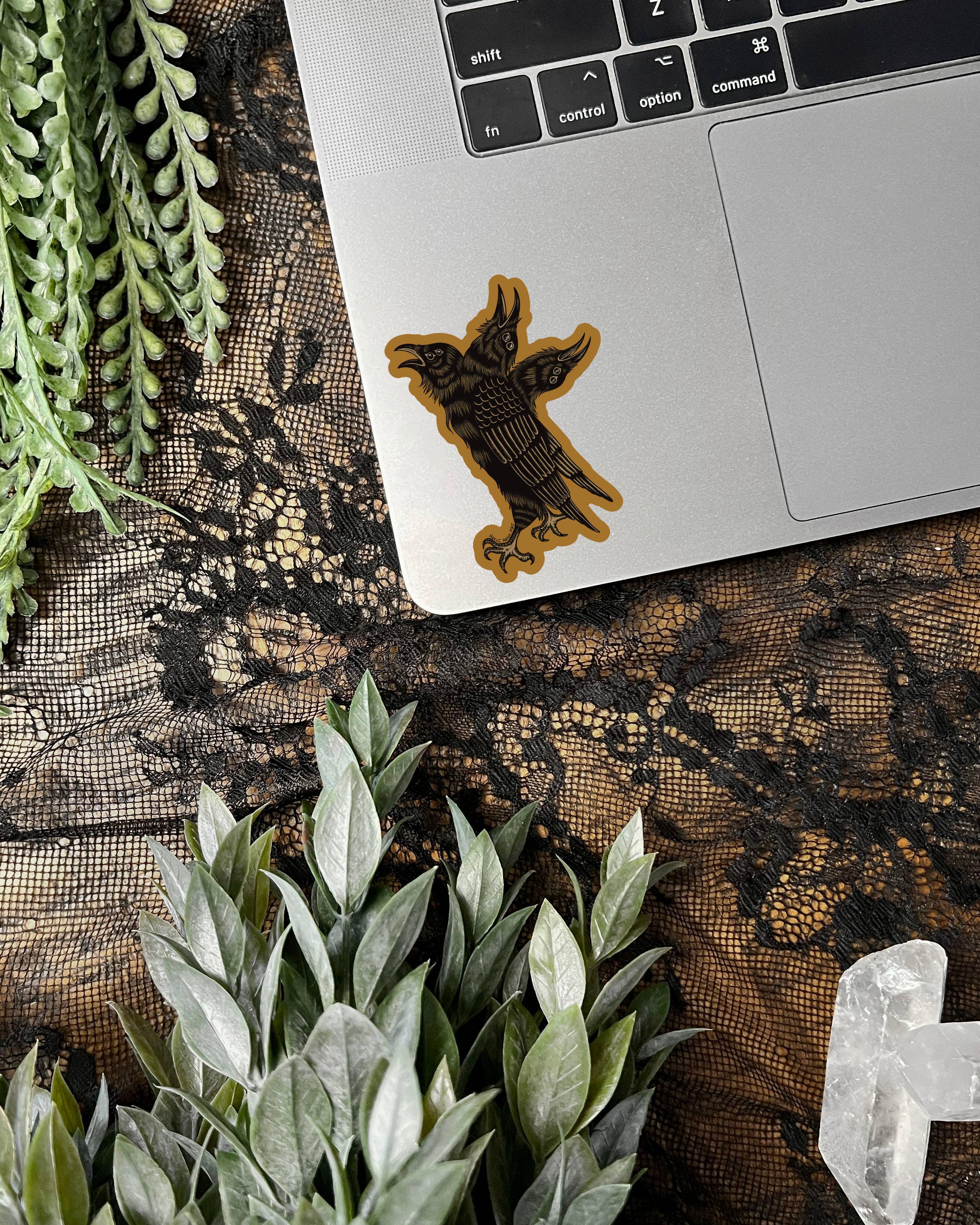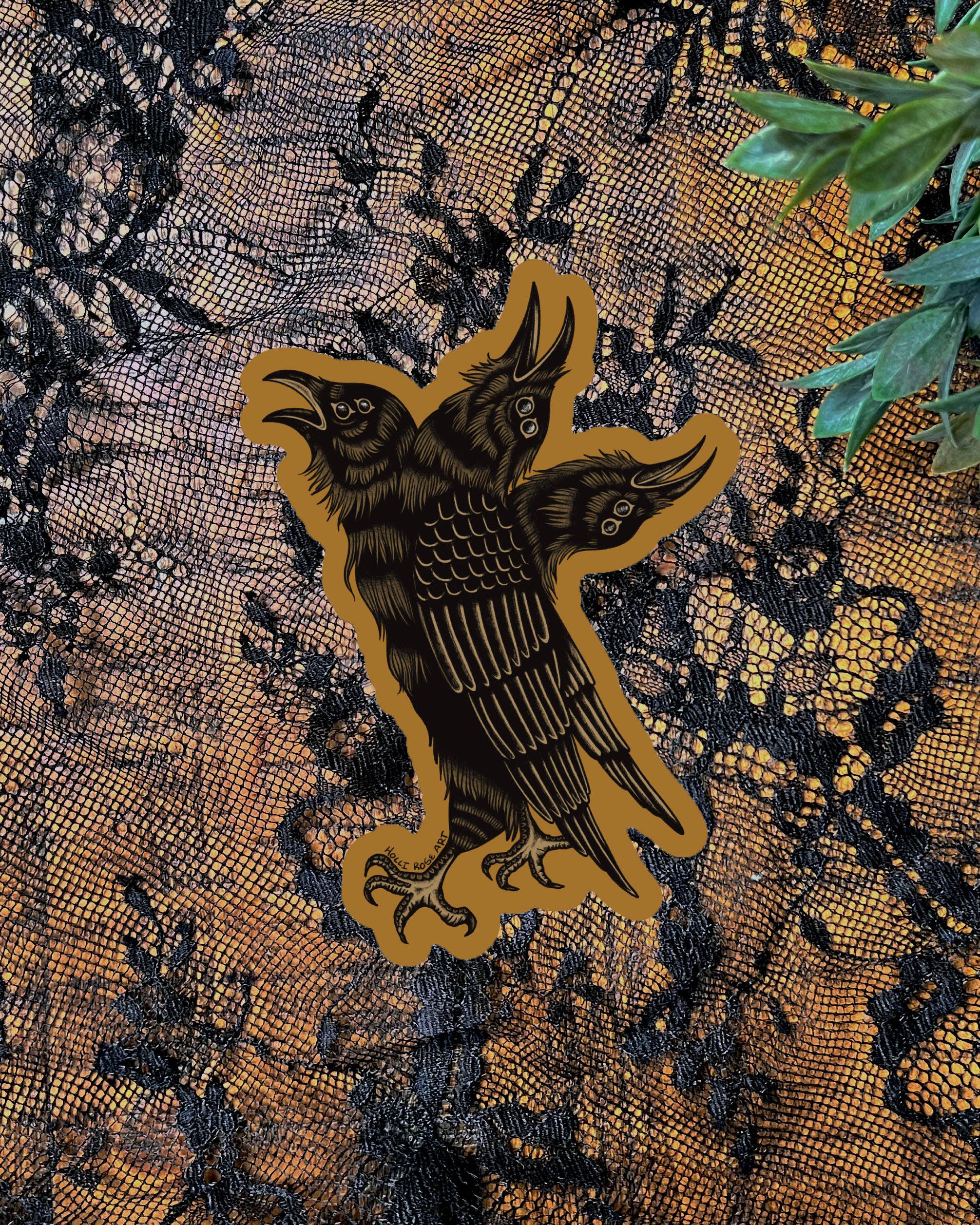 This spooky, three-headed raven sticker is made of matte, durable and waterproof vinyl! Great for slapping on water bottles, computers, walls, or wherever you like to slap your portable wall art!