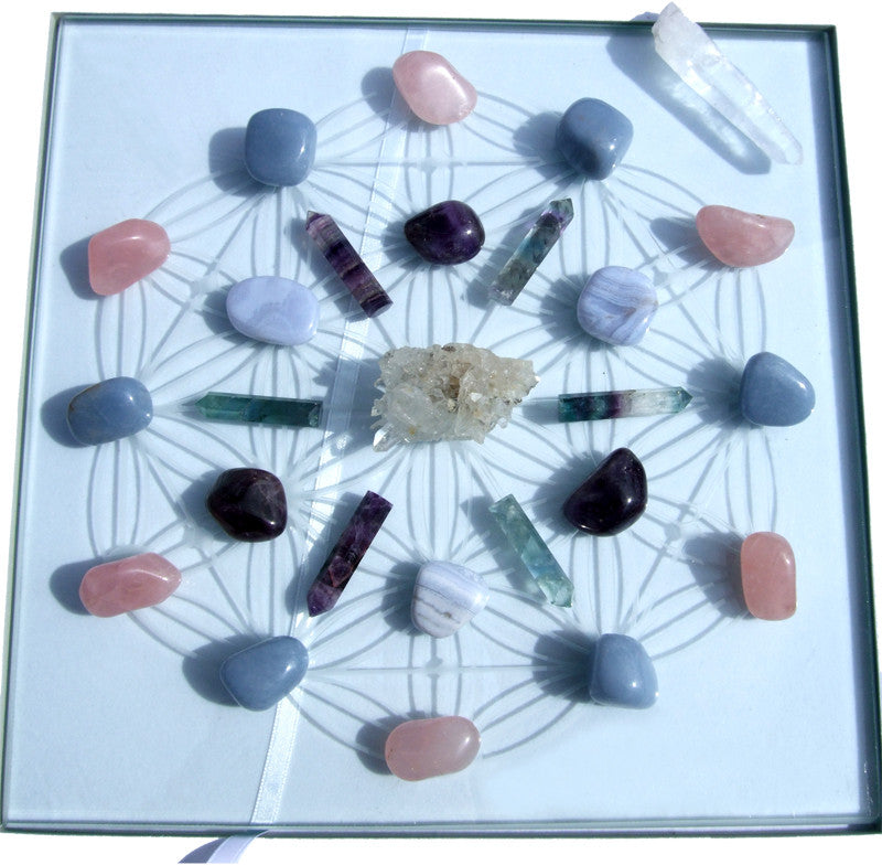 A crystal grid is a pattern made up of sacred shapes. When we align these shapes with gemstones and crystals it creates an energy vortex that can be used for self healing, healing others, self attunement, mediation, prayer, distance healing, affirmations and intentions, re-charging space, and communication with our higher self, planet earth & spirit.