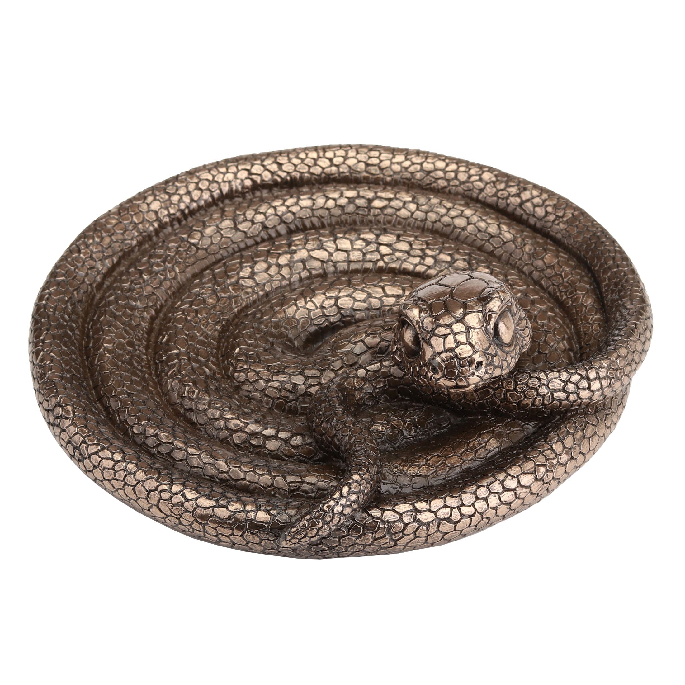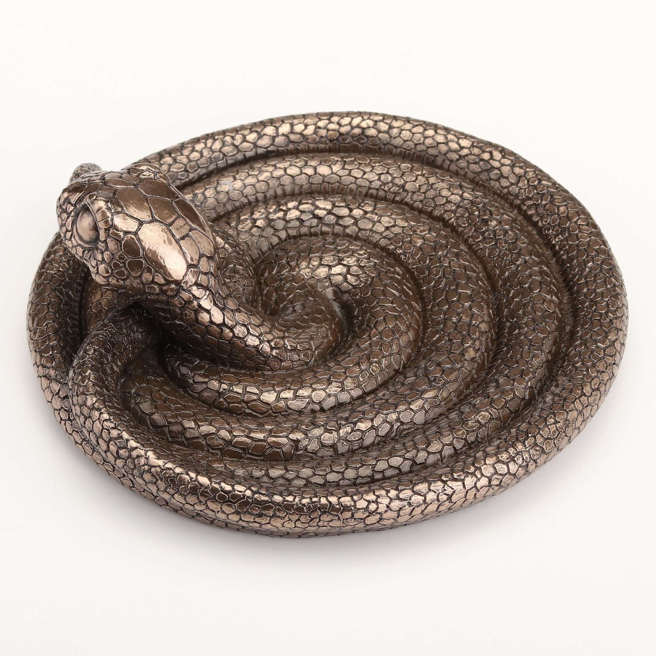 This striking Coiling Snake Plate makes a bold spiritual and decorative statement. Crafted in cold cast bronze, the serpent wraps tightly in a protective coil—symbolizing transformation, rebirth, and ancient wisdom. Whether used as an offering dish, altar centerpiece, or catch-all bowl, this piece embodies the energy of regeneration and personal power.