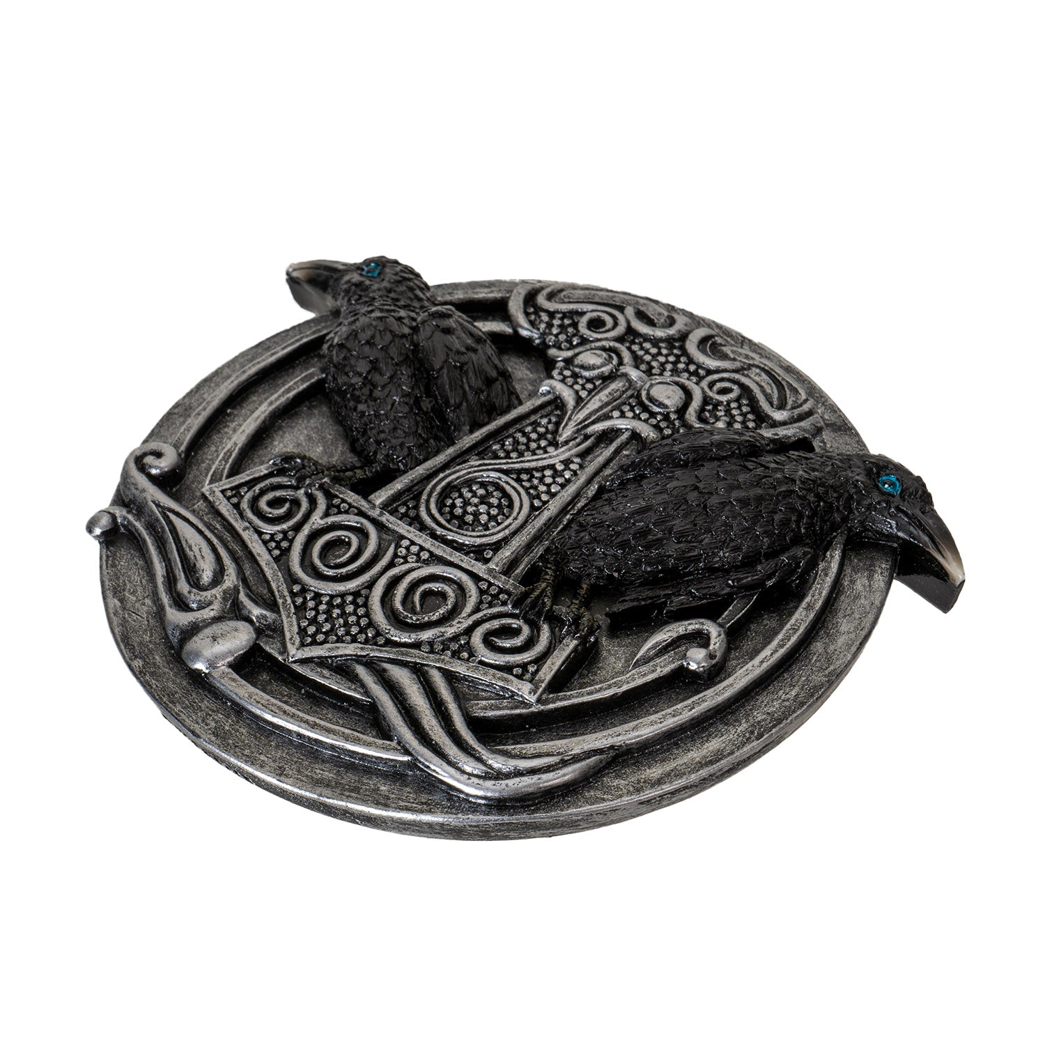 Crafted from durable cold-cast resin and finished in faux-metal tones of antiqued silver and deep black, this piece has the look of forged metal while remaining lightweight and practical. Thor’s legendary hammer, Mjolnir, stands at the center as a symbol of protection, strength, and divine power, while Odin’s ravens flank it—representing thought and memory as they watch over the realms.