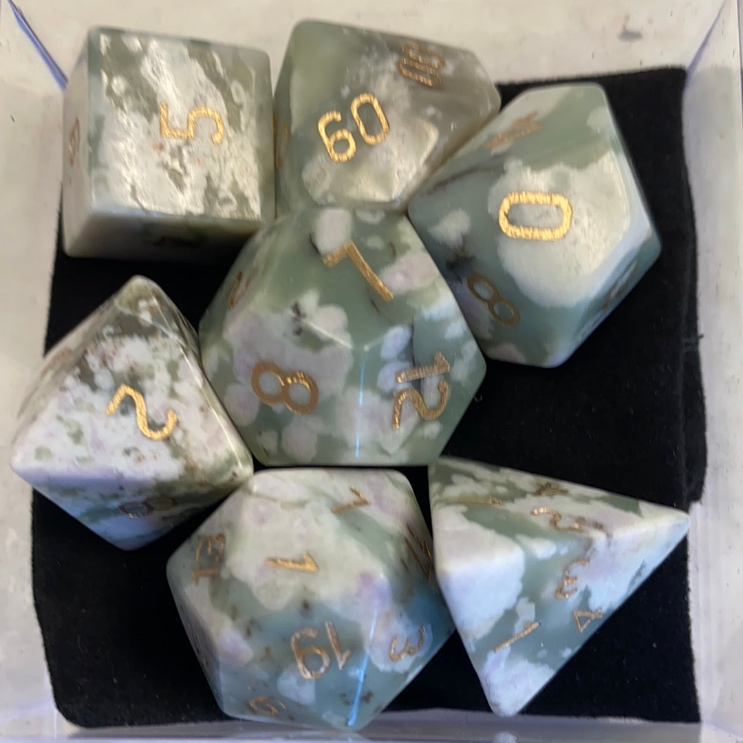 Peace Jade is a matrix of serpentine, white quartz, and occasionally lavender stichtite. Known to promote tranquility and serenity, the Peace Jade gemstone dice set protects your party from despair, death, & destruction.