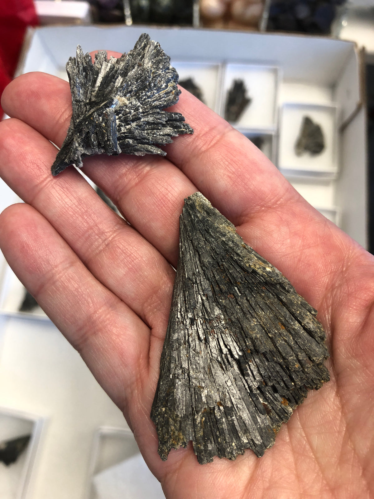 Kyanite derives its name from the Greek word kuanos meaning deep blue and used to be named Disthene meaning two strengths, referring to the different hardness of the perpendicular axes of each blade. Blue, black, green, and orange Kyanite are used for metaphysical purposes but they can be found in a range of colors including pink, white, yellow, and grey. Kyanite has heat-resistant applications in the industrial world and has been used in the porcelain of dentistry and bathroom ware, as brake pads and grinding discs, and in kiln bricks.