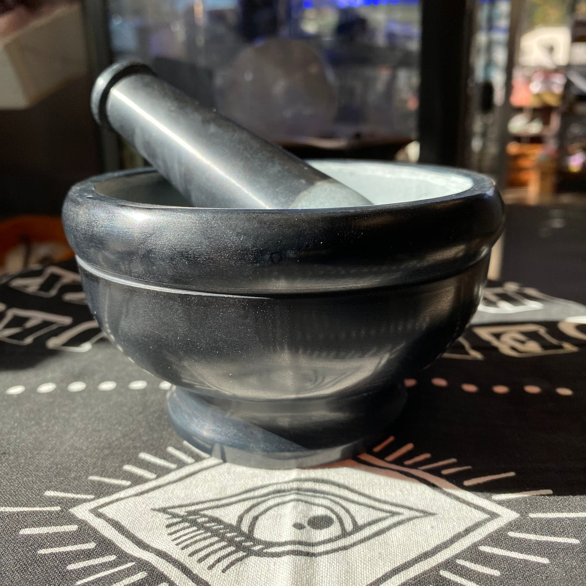A mortar and pestle is a tool for crushing herbs and other materials. This set consists of a bowl (the mortar), made of black soapstone, and a heavy pounding tool (the pestle), made of the same material. The pestle fits inside the bowl and crushes materials inside the bowl. A mortar and pestle may be used for pounding grains to remove the hulls or to make flour. Magic-users normally use mortar and pestles to grind ingredients for magical spells, kitchen witchery, incense, and alchemy. Mortars and Pestles have been in use by cooks, healers, and magicians for millennia. There is evidence of their common use in Egypt prior to the 1500s BCE.