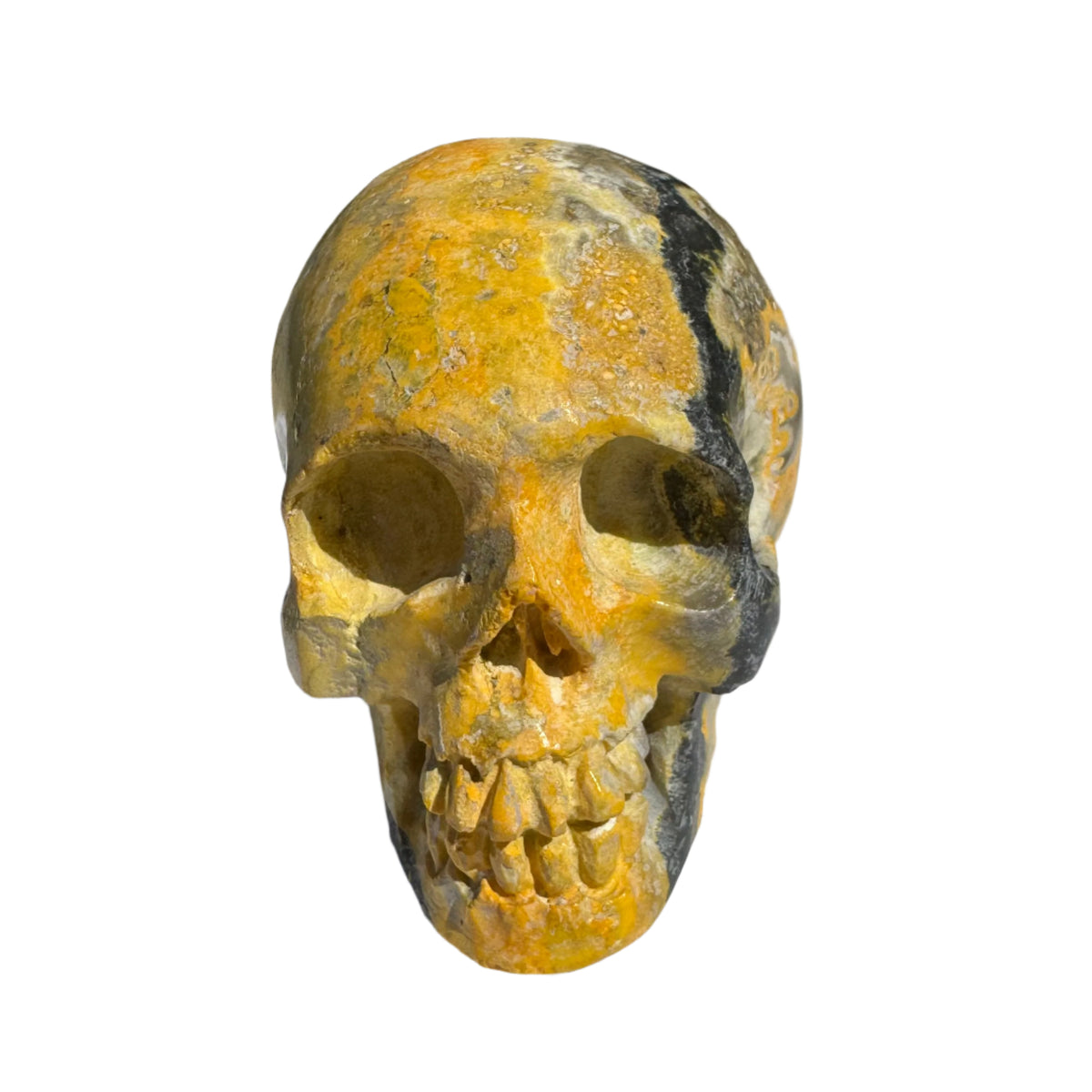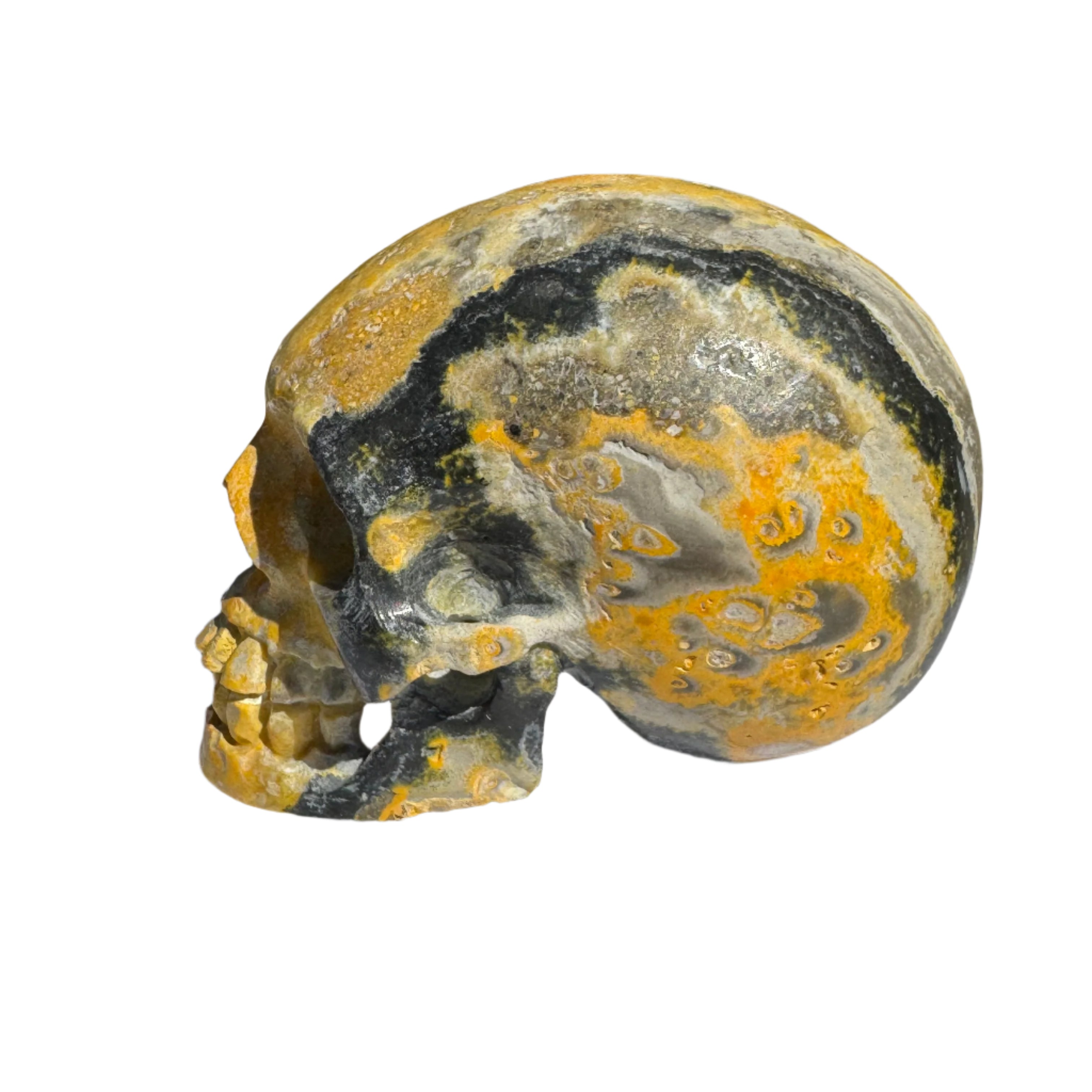 This Bumblebee Jasper Natural Crystal Skull (3.0") is a vibrant and eye-catching piece believed to spark creativity, mental clarity, and personal power. Its brilliant yellow, orange, and black layers make it as visually striking as it is energetically potent.