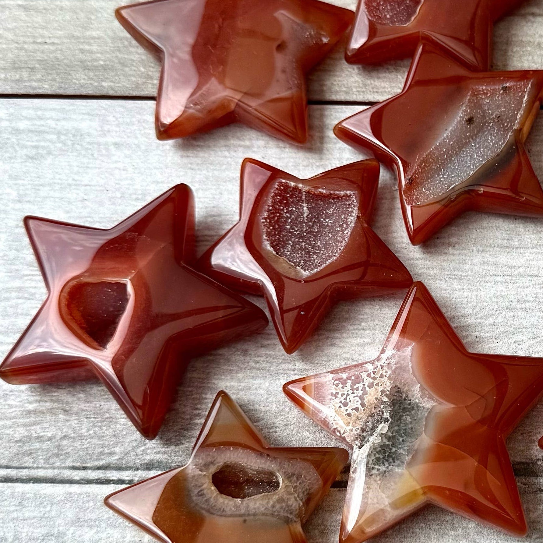 Because Carnelian forms naturally with unique textures, each star may feature natural cracks, caves, or druzy pockets—beautiful reminders of the Earth’s artistry and the stone’s raw, authentic energy.