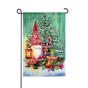 This garden size suede flag has two designs on the front and back! Both sides feature a Scandinavian patterned gnome holding a candy cane.