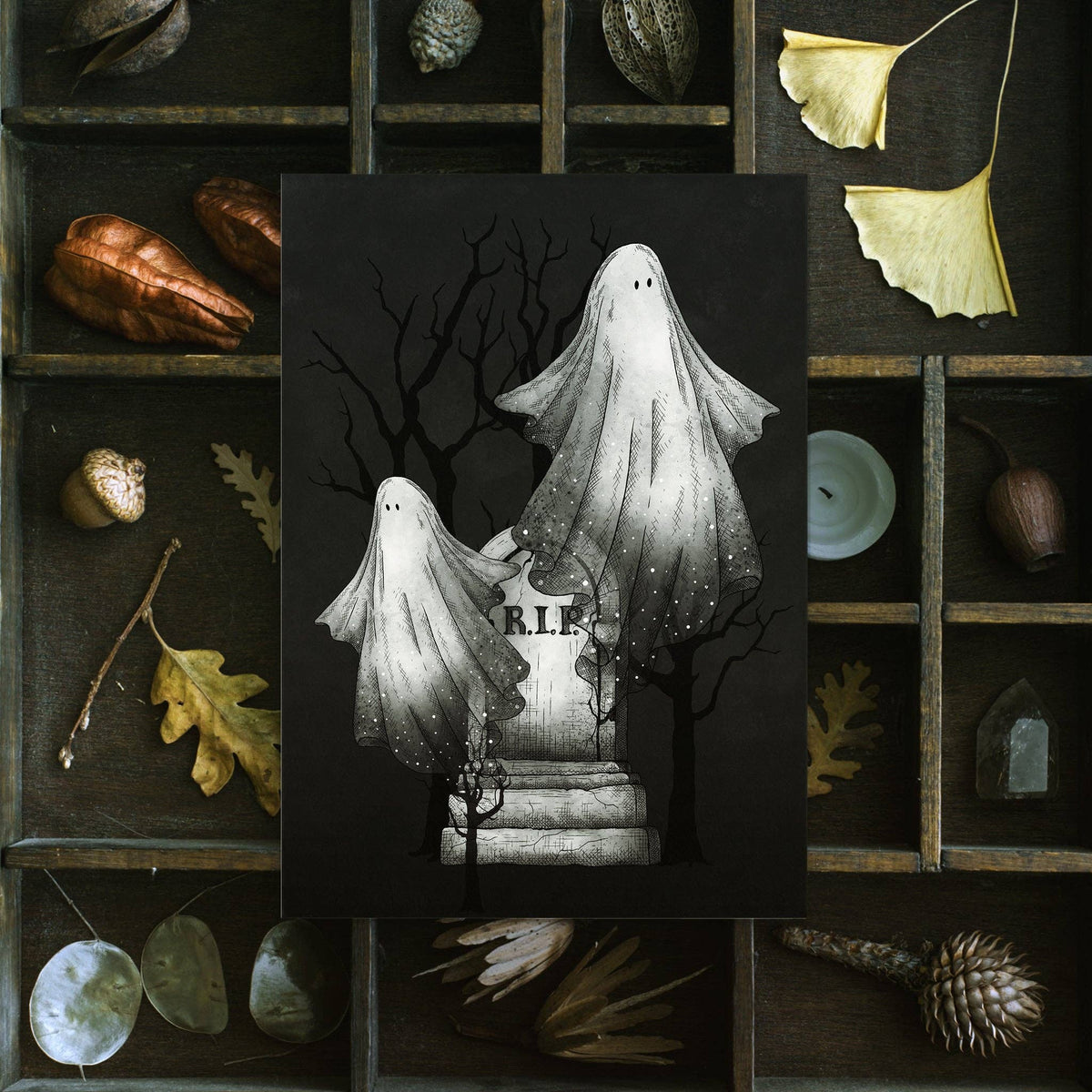 A cute postcard of a ghost duo. SIZE: This postcard mini print measures: A6 / 10.5 x 14.8 cm / 4.1 x 5.8 inch MATERIALS: Printed on 300gsm 'TruCard' – a specialist postcard material that is glossy coated and scratchproof on one side and uncoated on the other side so you can handwrite a personal message if you wish. Supplied unpackaged. Back is uncoated with small Print is Dead logo.