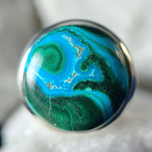Chrysocolla Malachite is one of the most beautiful cabochon stones! Chrysocolla stone, a copper silicate, blends well with Malachite, a copper carbonate. This colorful blue green gemstone material is found in the oxidation zone of major copper deposits. All of our Chrysocolla Malachite comes from Arizona.