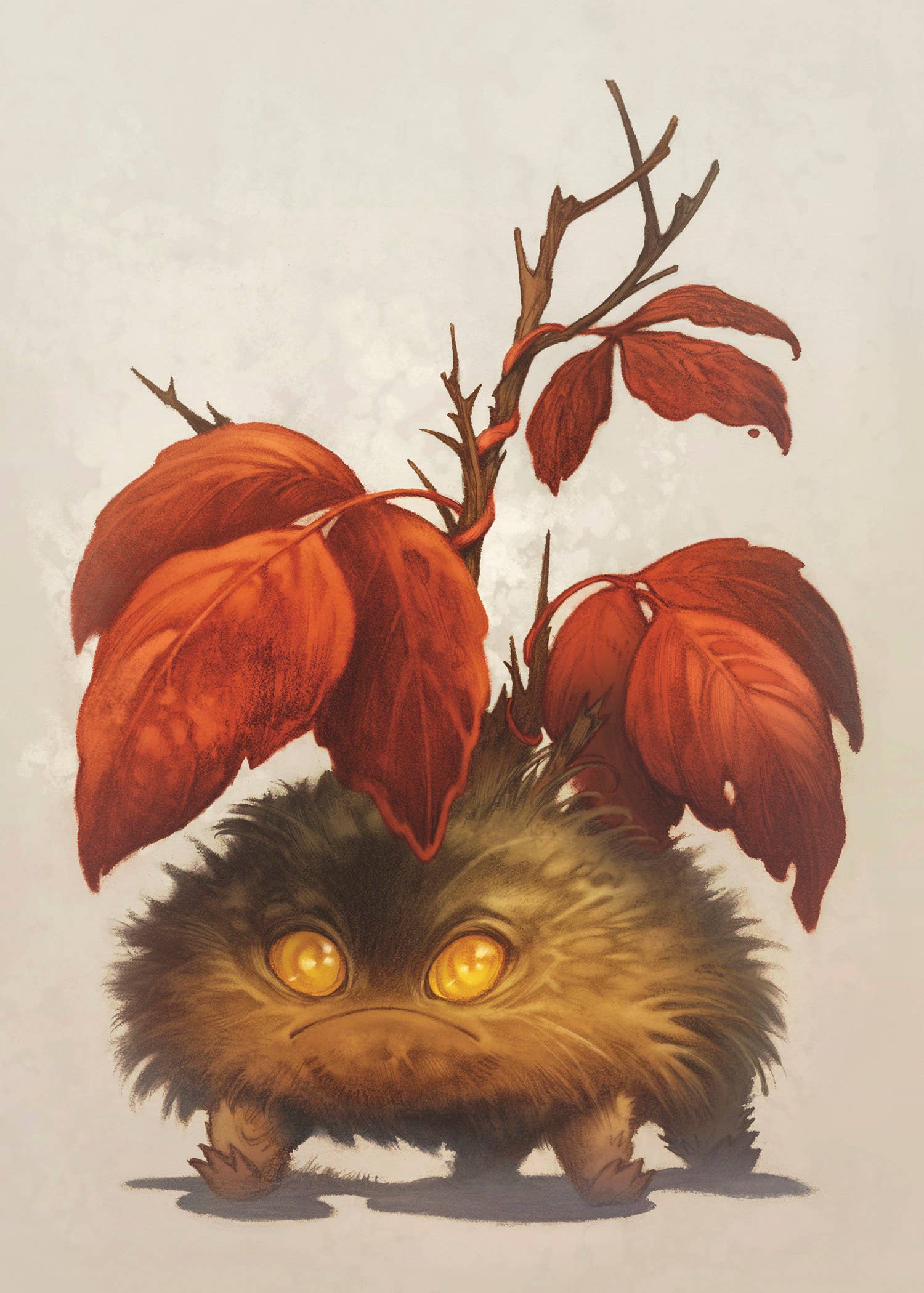 This exquisitely illustrated artwork depicts a little plant creature with poison ivy! Watch out!