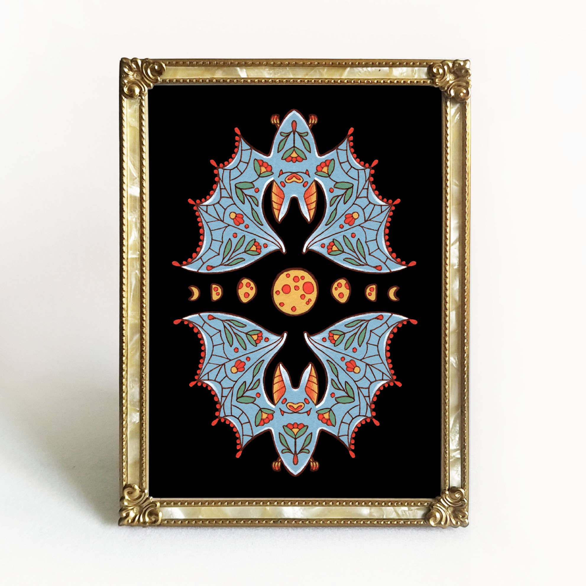 A beautiful and artistic print of folk art bats and the moon phases. The artwork was originally made by Russian-born artist Faina Lorah.
