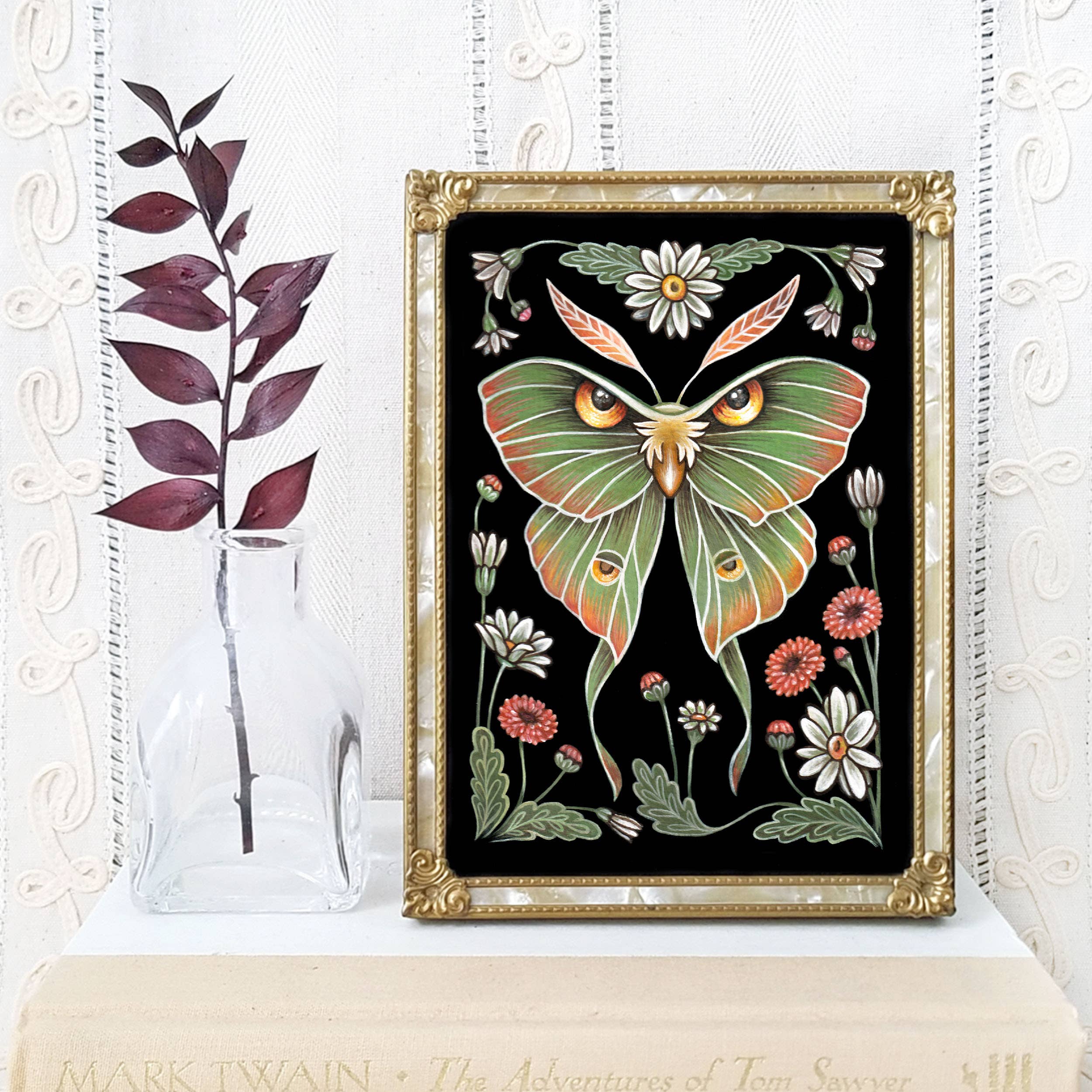 A beautiful and artistic print of a mystical luna moth surrounded by quaint wildflowers. The artwork was originally made by Russian-born artist Faina Lorah.