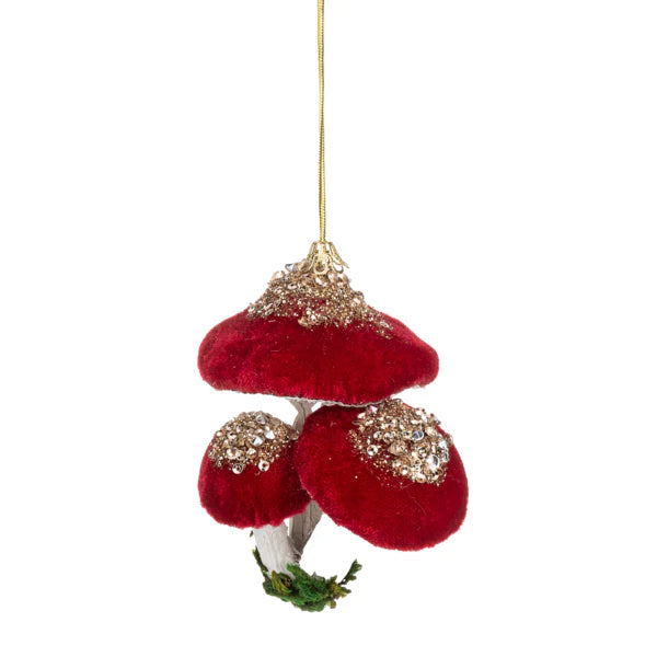 • Mushrooms straight out of a woodland fairy wonderland, three colors to choose from: Red, Green or Gold. Each velvety grouping of three are generously dusted with glitter and chunky beads and and sit on a bed of natural green moss.