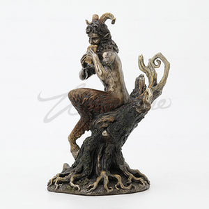 Not only is he perhaps one of the most recognized satyrs in mythology, but Pan is recognized as a Greek god of the wilds and of rustic music. In the Pan Statue, the half-man, half-goat sits atop a stump, pipes held securely in hand. Being a satyr, Pan has the legs of a goat, but the upper body of a man. He is shown as a man with a rugged face and a thick beard, with rounded, curling horns that sprout from the side of his head. In his hands, he holds a set of pipes, while his legs dangle down along the length of the tree trunk that is his seat. This simple, rustic statue is made from cold cast resin, which has been hand-painted to give the statue a cast bronze metal appearance. The Pan Statue depicts a classic and well-known figure from Greek mythology in a form that collectors and enthusiasts would be glad to include in their own personal collections and decor.