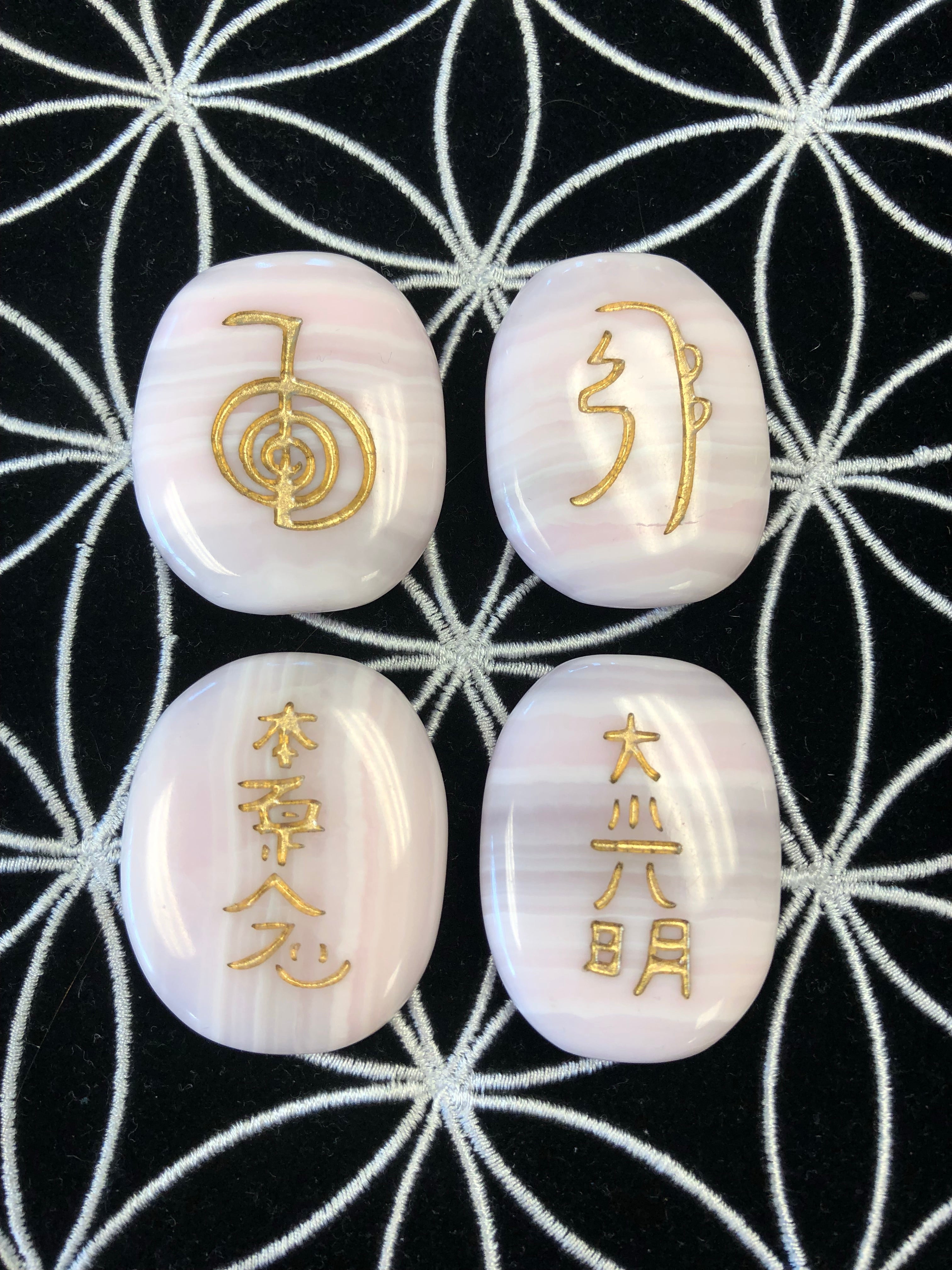 Our Pink Mangano Calcite Reiki Set of 4 includes four fully engraved and hand-painted stones that are approximately 1-1.5 inches (4-5 cm) in size. Each stone is carefully selected for its unique personality, energy, and vibration, making each set one-of-a-kind. These beautiful stones come with a carrying bag for safekeeping, and each set is created and blessed by a REAL Reiki Master.
