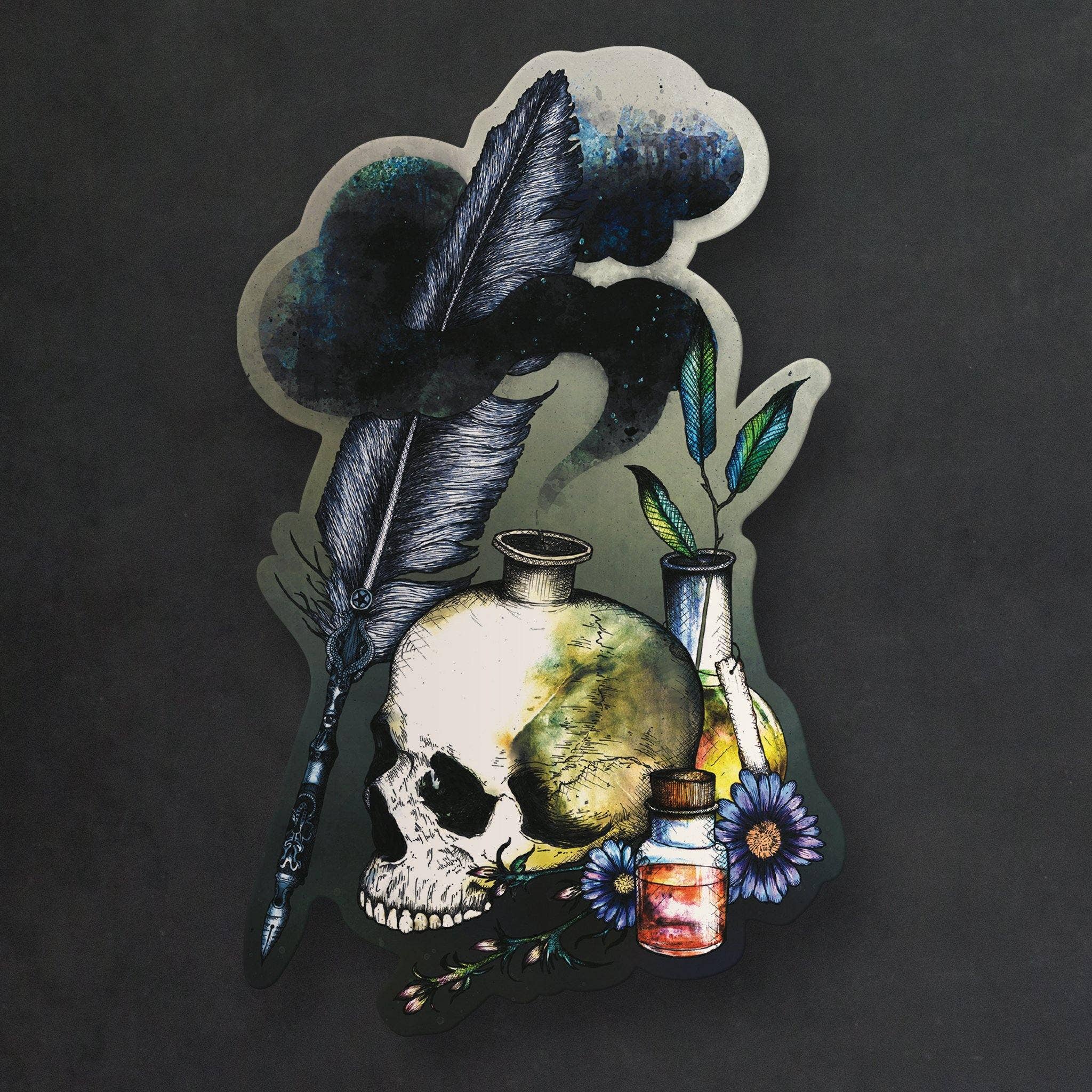 A beautiful vinyl art sticker of a quill and ink bottle made from a skull, surrounded by apothecary style potion bottles and herbs. Available in Colour or Black and White. SIZE:  These stickers measure: Approx. 9.1 x 14.5 cm MATERIALS: Digitally printed onto heavyweight gloss vinyl using UV stable, weatherproof inks. They are made from 100 microns thick monomeric white gloss vinyl with a clear permanent acrylic adhesive with residue free removal. Suitable for indoor and outdoor use with up to 4 years outdoor durability. Stickers are supplied unpackaged.