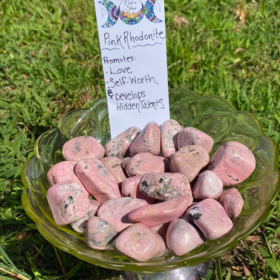 Rhodonite is a stone of compassion, an emotional balancer that clears away emotional wounds and scars from the past, and that nurtures love. It stimulates, clears, and activates the heart. Rhodonite grounds energy balances yin-yang, and aids in achieving one’s highest potential. It heals emotional shock and panic. Rhodonite aids in cases of emotional self-destruction, codependency, and abuse. It encourages unselfish self-love and forgiveness. Promotes remaining calm in dangerous or upsetting situations. Builds confidence and alleviates confusion.