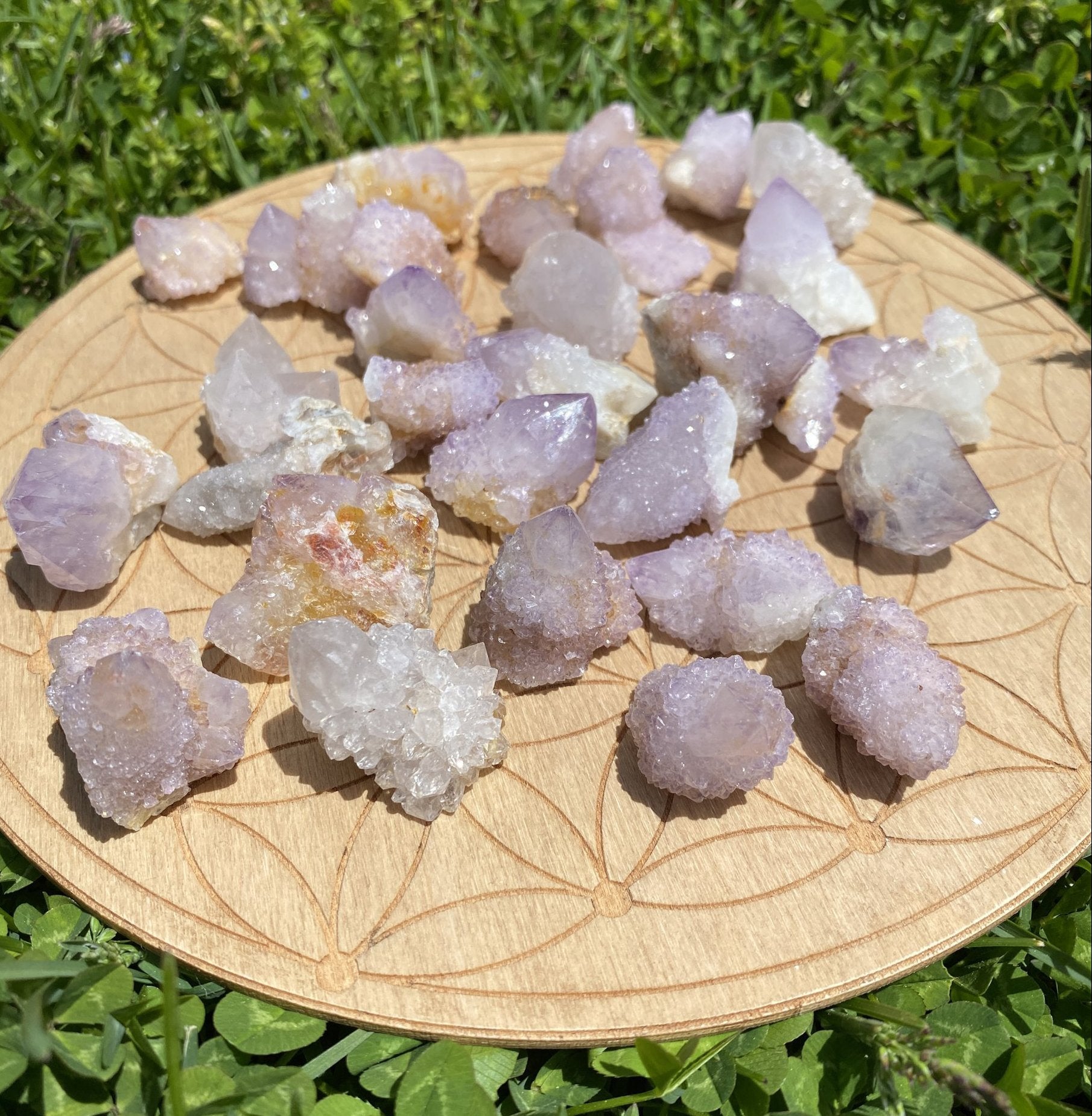 Also known as Cactus Quartz, Cactus Amethyst, Porcupine Quartz, or Spirit Crystals, these crystals are I only found in South Africa. It is characterized by the formation of tiny, druzy crystals covering the shaft of a larger quartz point. Spirit Quartz is found mainly as light-colored Amethyst, which gave it its name after a South African window cleaning product called Spirit which is the same light purple color. It is also found in Clear Quartz and less often in Citrine or Smoky Quartz. Traditionally Spirit Quartz has been used to support astral travel, shamanic journeying, dreamwork, rebirthing, and meditation.