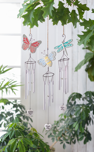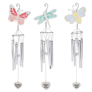 Perfect for anytime of the year, these windchimes feature different whimsical designs with etched hearts dangling below! The Butterfly, Dragonfly, and Honeybee all are beautiful and have their own inscriptions on the hearts: