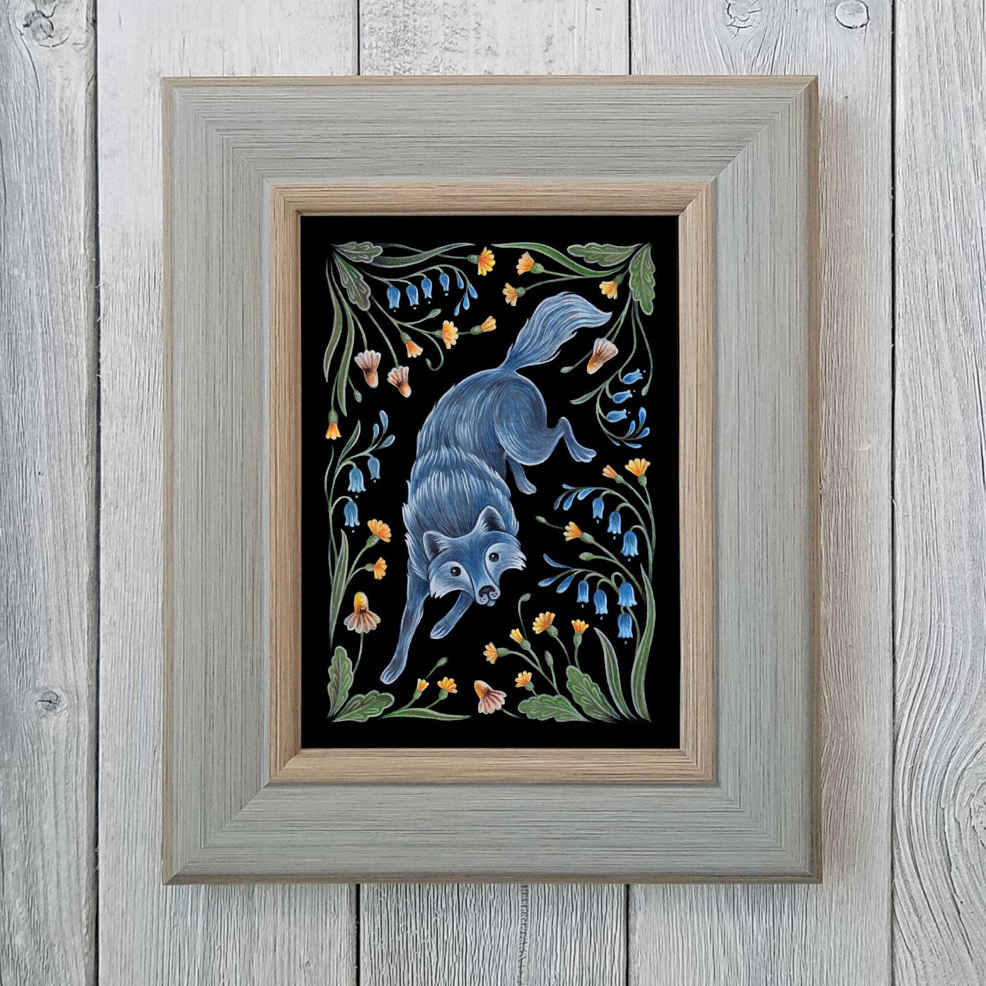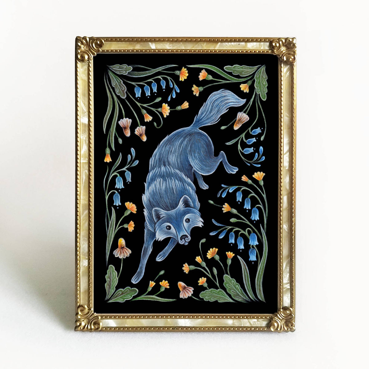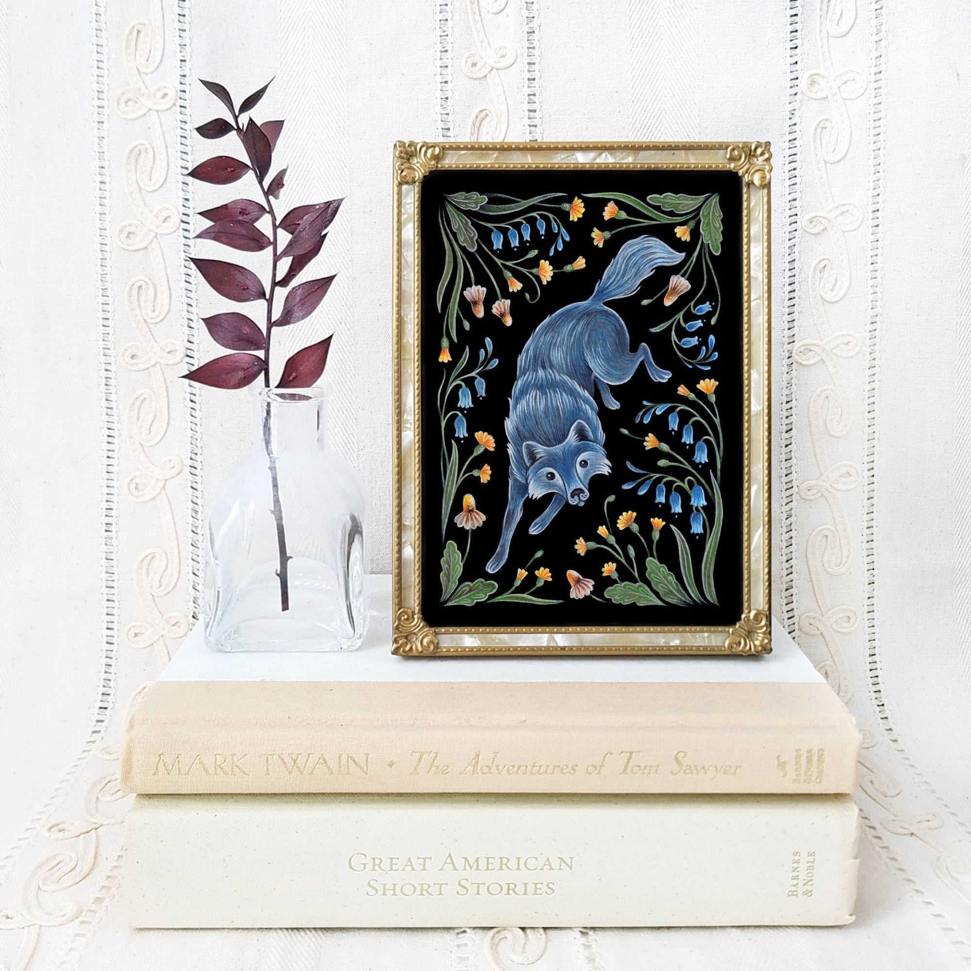 A beautiful and artistic print of a charming wolf surrounded by quaint wildflowers and woodland shrubbery. The artwork was originally made by Russian-born artist Faina Lorah.