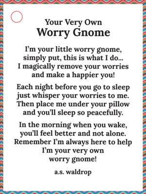"I'm your little worry gnome, simply put, this is what I do... I magically remove your worries and make a happier you! Each night before you go to sleep just whisper your worries to me. Then place me under your pillow and you'll sleep so peacefully. In the morning when you wake, you'll feel better and not alone. Remember I'm always here to help. I'm your very own worry gnome!”